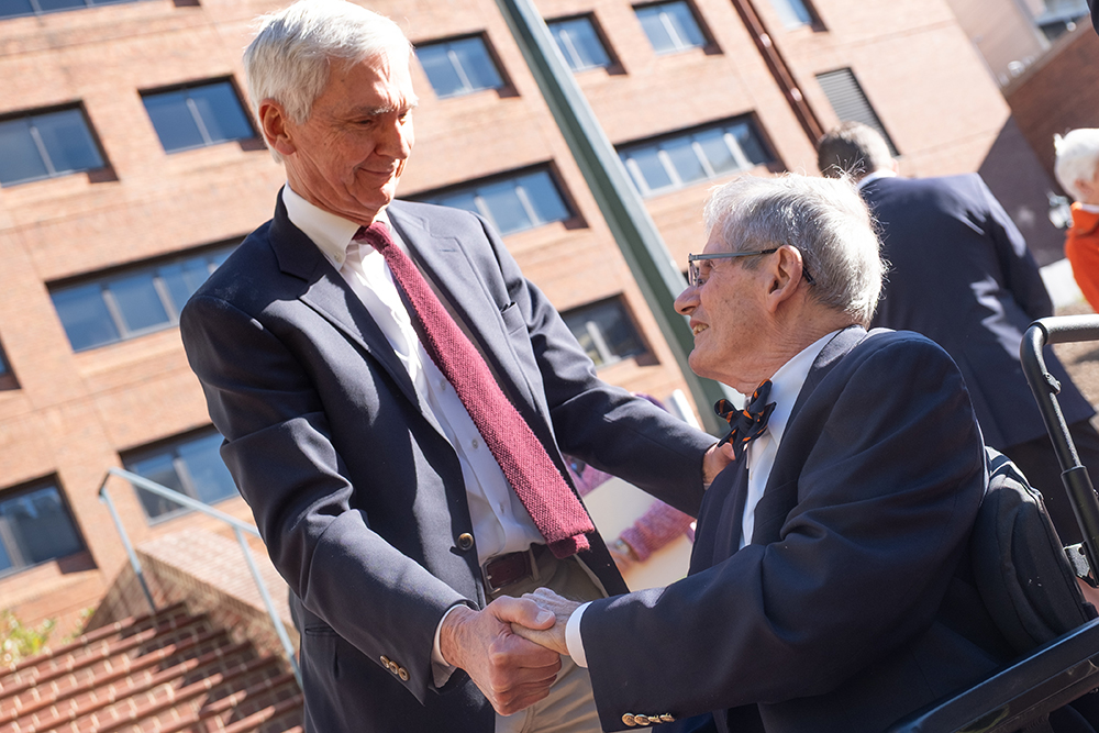 On Friday, October 24, the University of Virginia School of Medicine and the UVA Medical Alumni Association co-hosted a special ceremony to honor the legacy of Robert M. Carey, MD, Res ’66, with the dedication of the newly named Carey Courtyard and the unveiling of a commemorative bust. Held in the courtyard between the MR4, MR5, and MR6 buildings, the event welcomed more than 100 attendees, including family, friends, alumni, colleagues, and leaders from UVA and UVA Health.